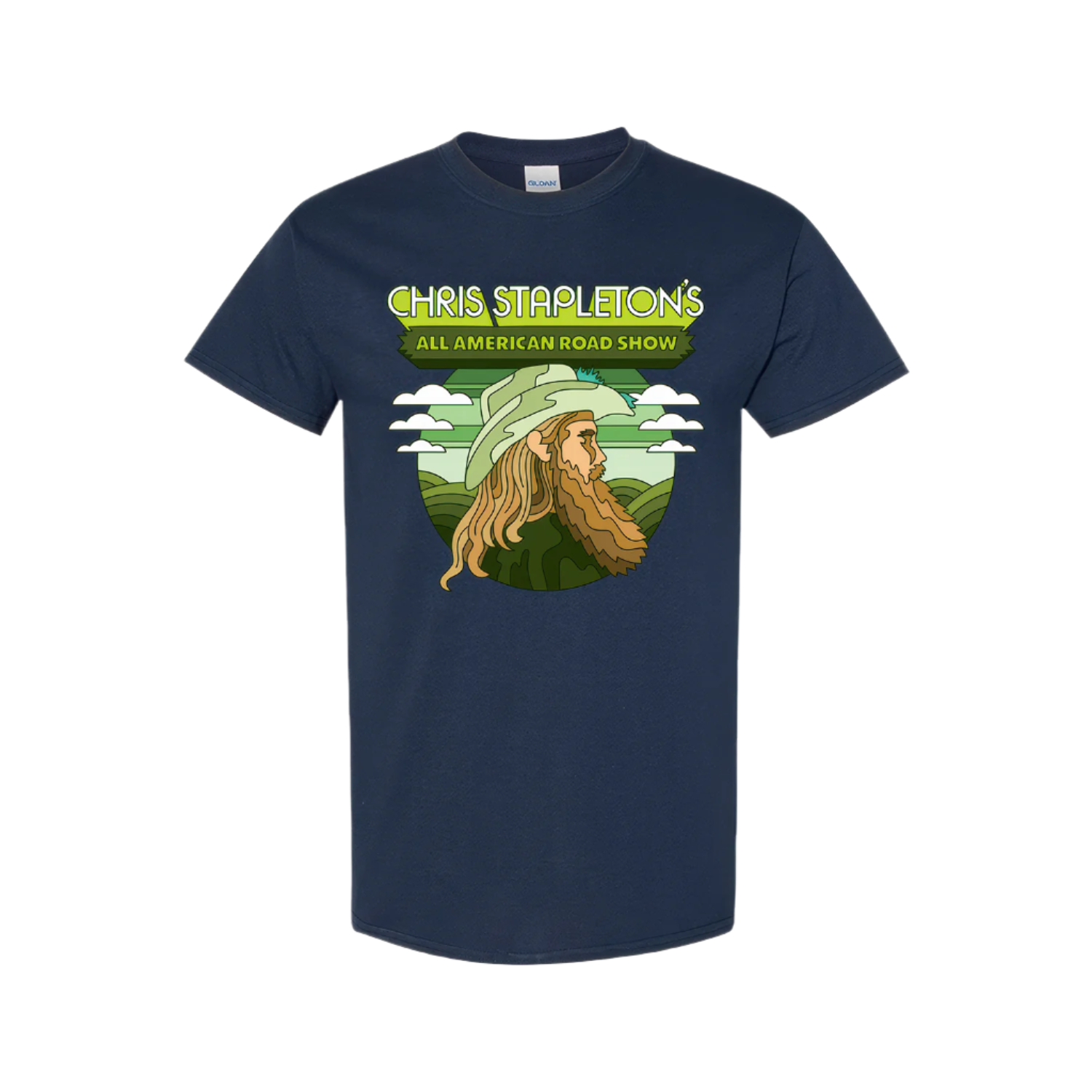 100% navy heavyweight cotton tee, featuring Draplin admat tour art on the front and tour dates on the back.