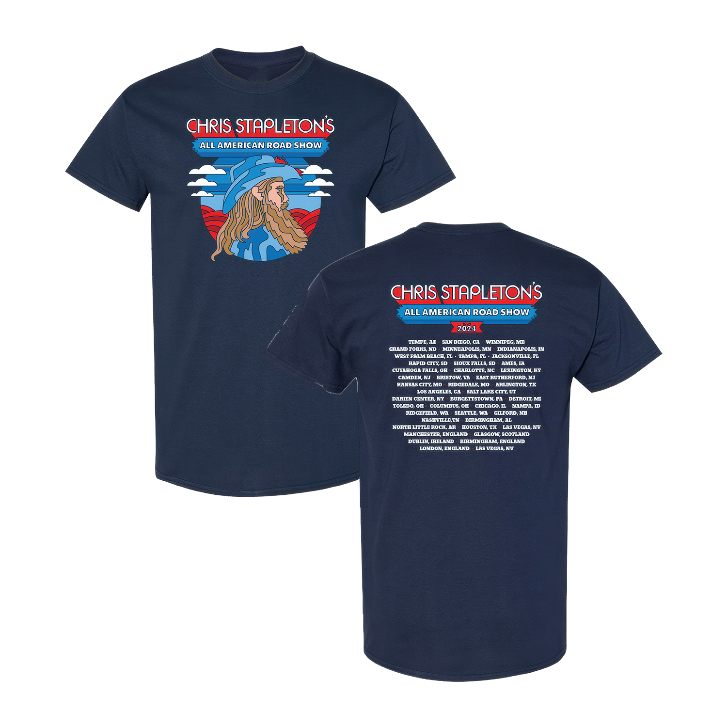 100% navy heavyweight cotton tee, featuring 2024 Draplin admat tour art on the front and tour dates on the back.