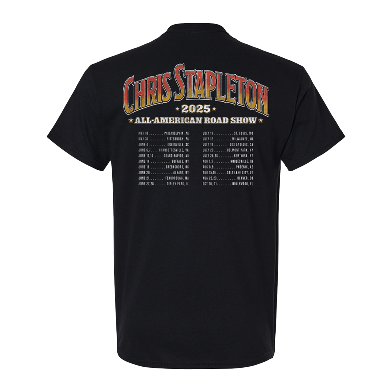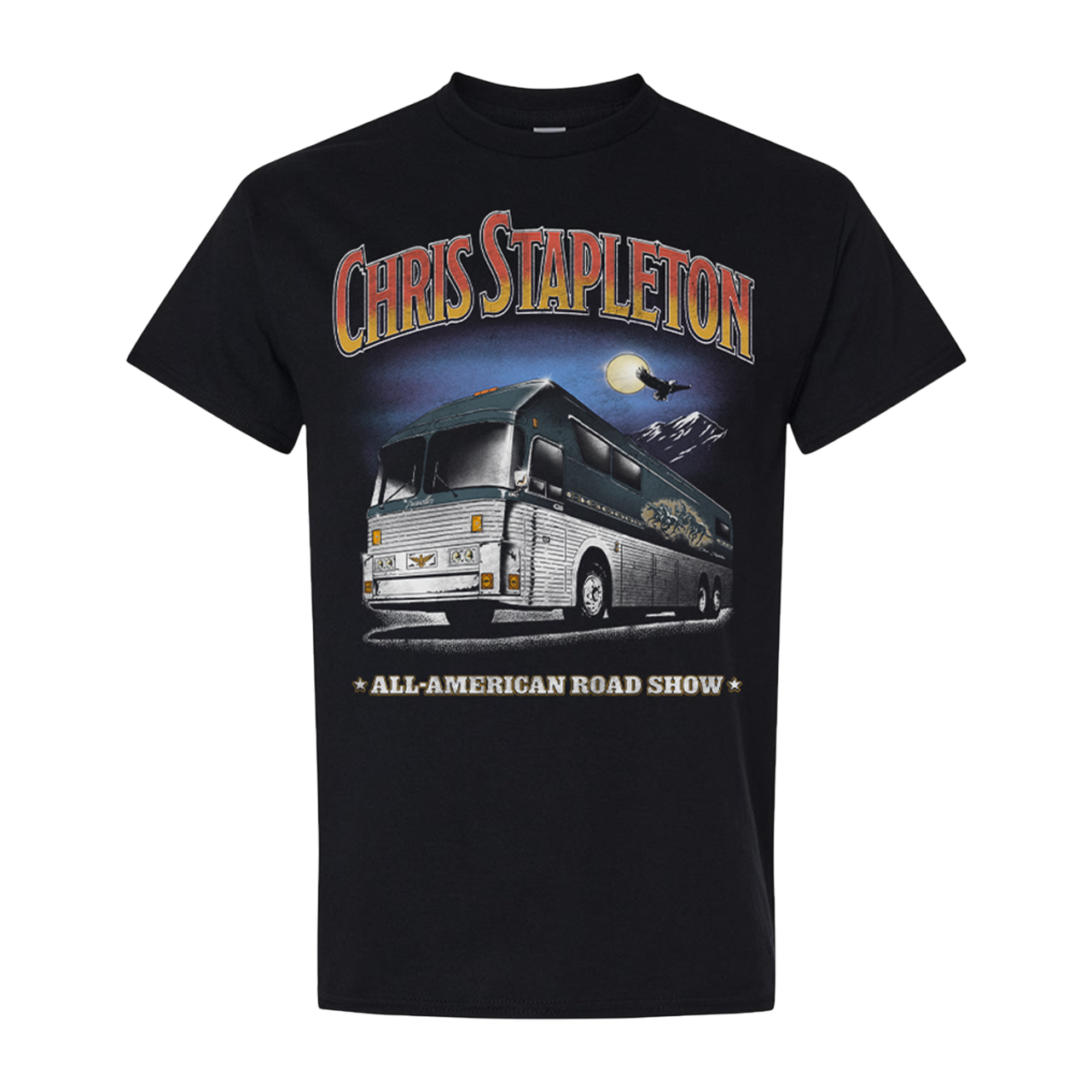 Black 100% cotton tee featuring 2025 Tour Bus design printed on front and back.