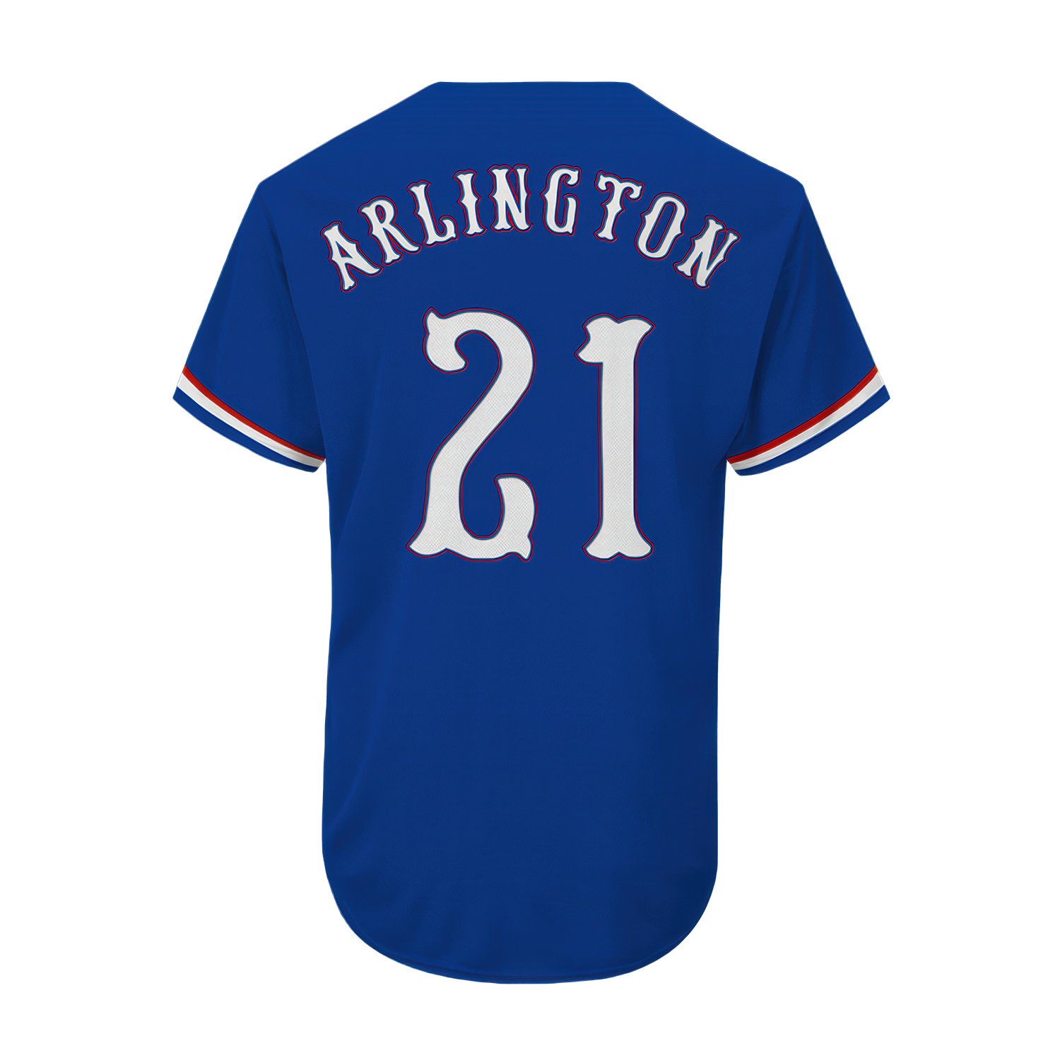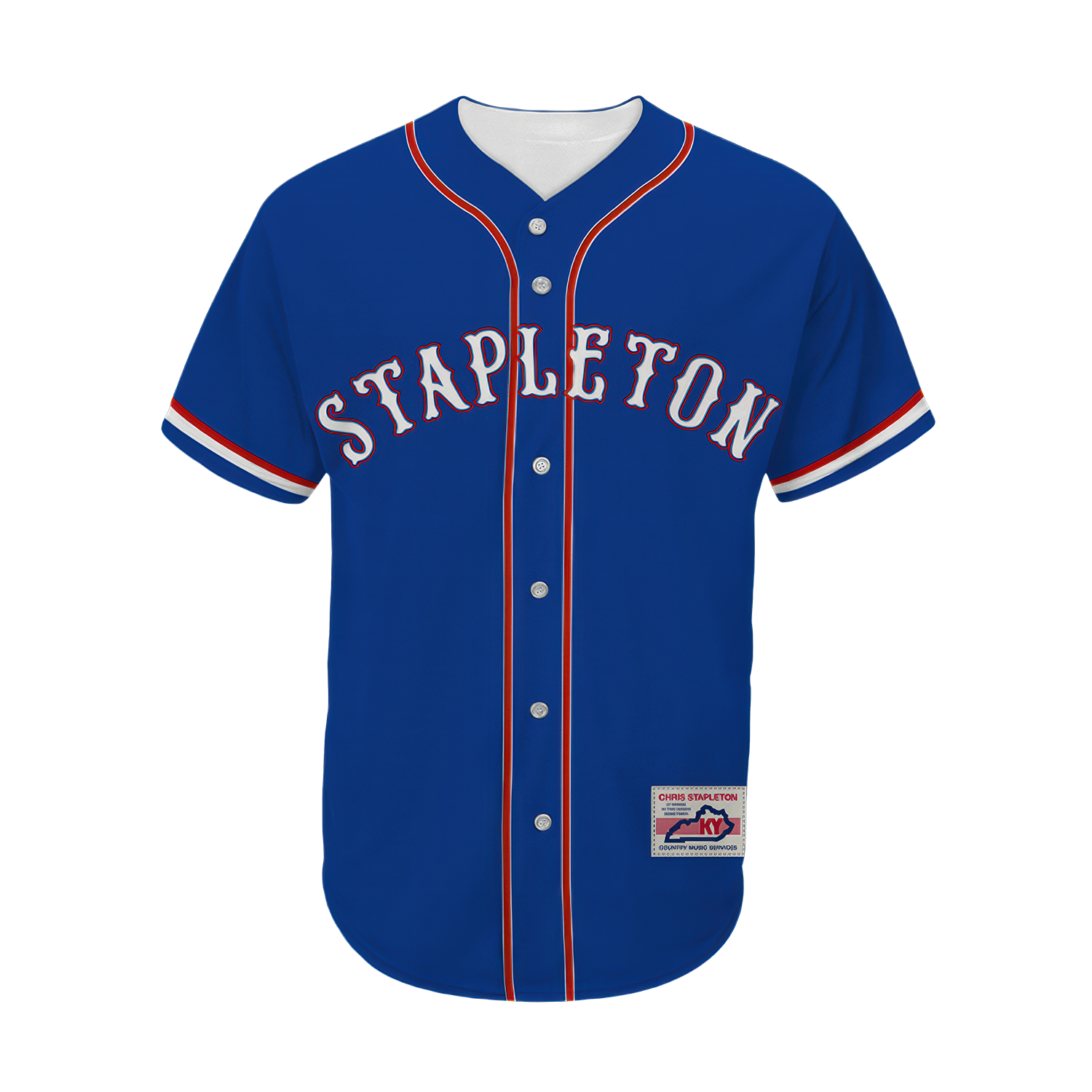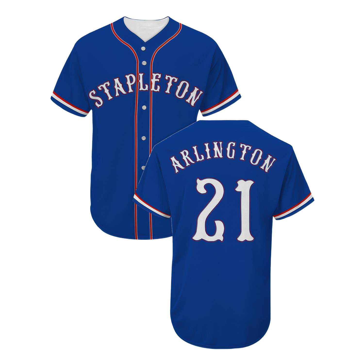 100% polyester royal Chris Stapleton baseball jersey featuring Stapleton sewn applique on the front and Arlington #21 sewn applique on the back.