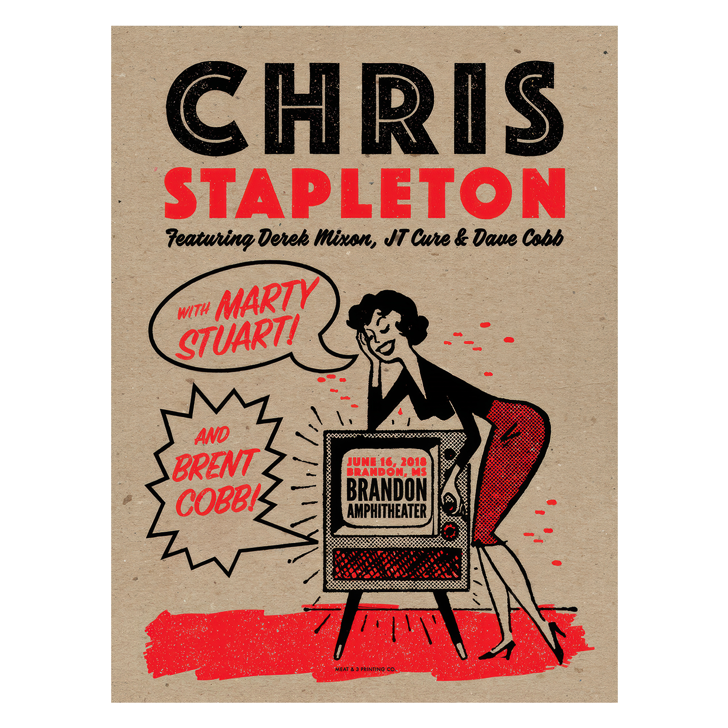 Limited Edition screen printed poster from 6/16/18 in Brandon, MS. Designed by Carl Carbonell of Meat and Three. 18 x 24.