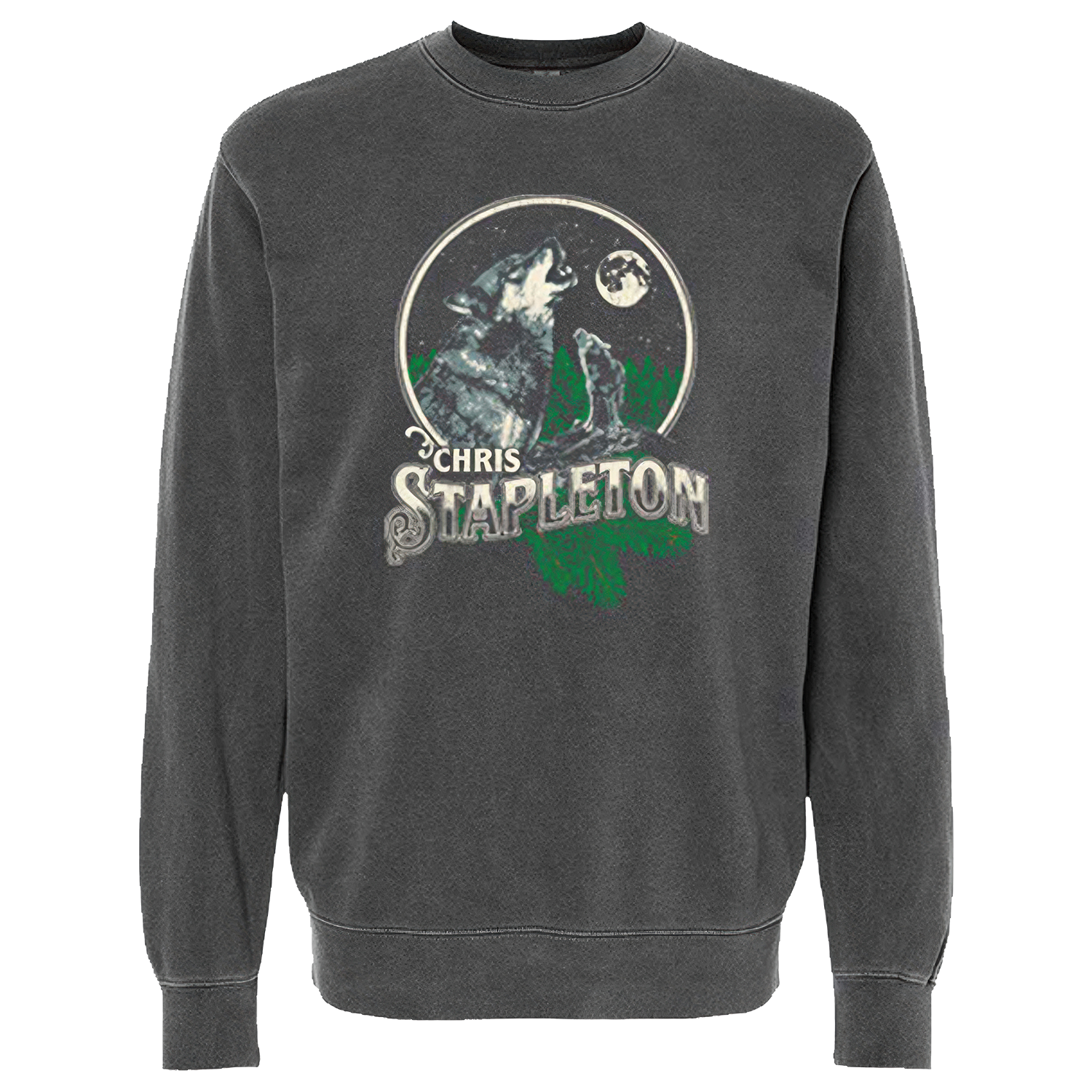 Pepper garment dyed crewneck sweatshirt featuring Chris Stapleton Howling Wolf design.