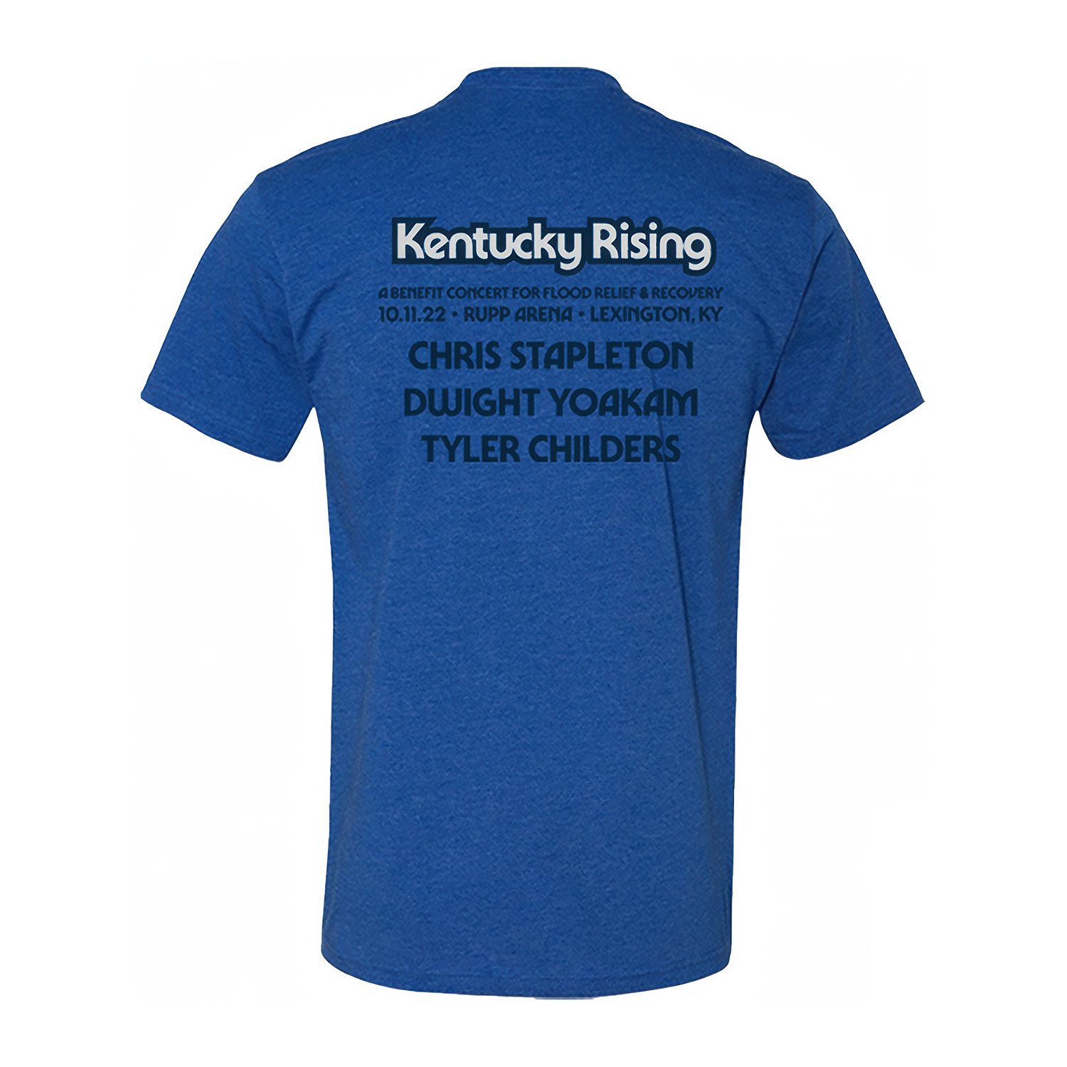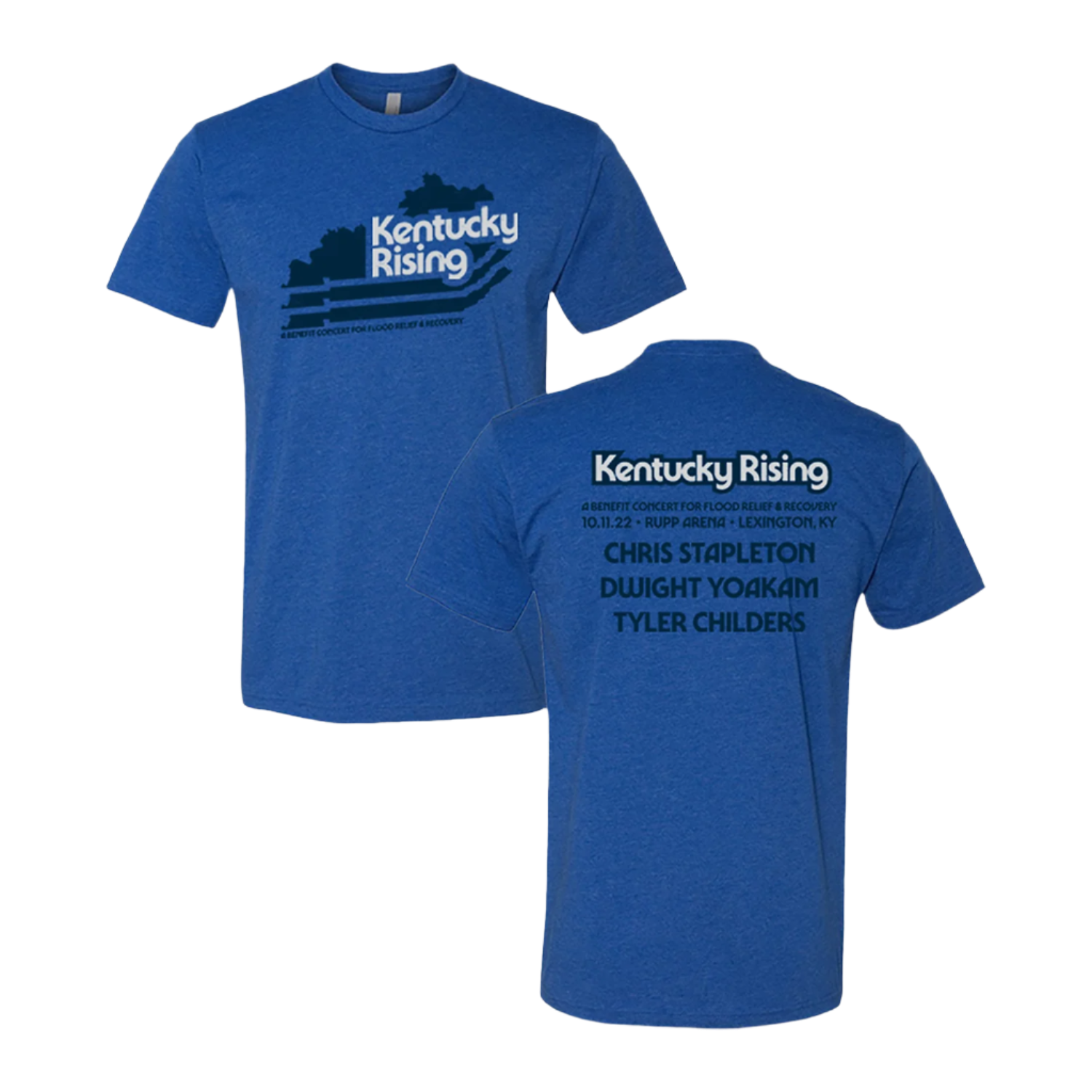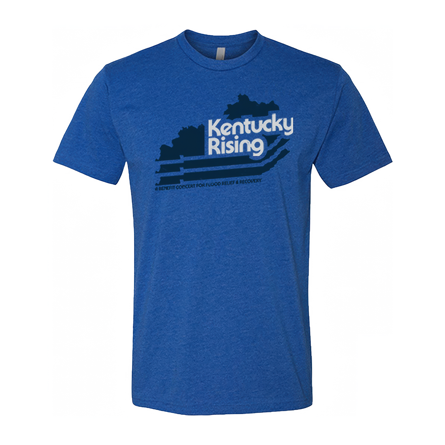Heather royal cotton/poly blend tee featuring Kentucky Rising State outline artwork on front and show info on the back