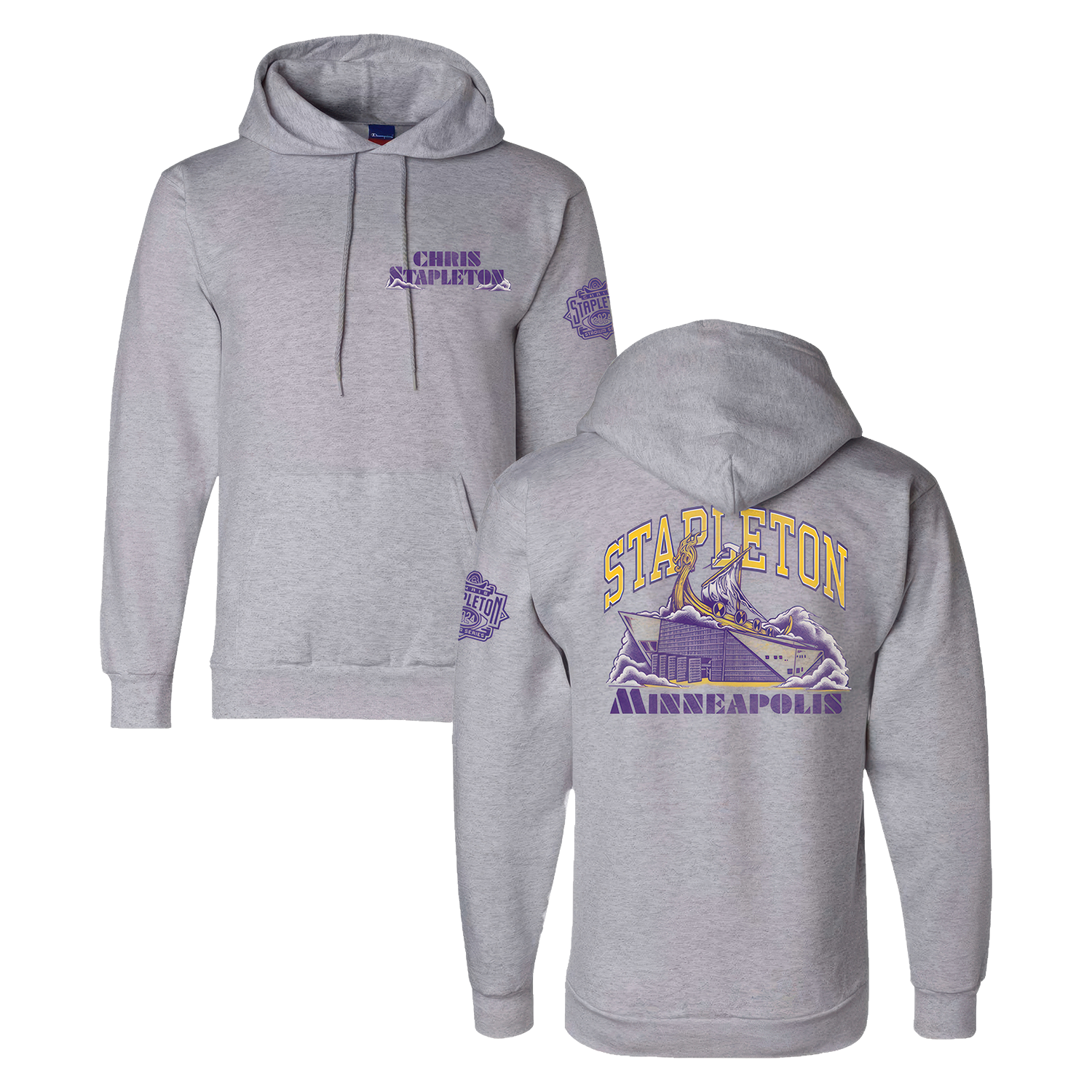 Champion Powerblend Hooded Sweatshirt in color Steel Grey, featuring Minneapolis Stadium Series designs on front, back and left sleeve.
