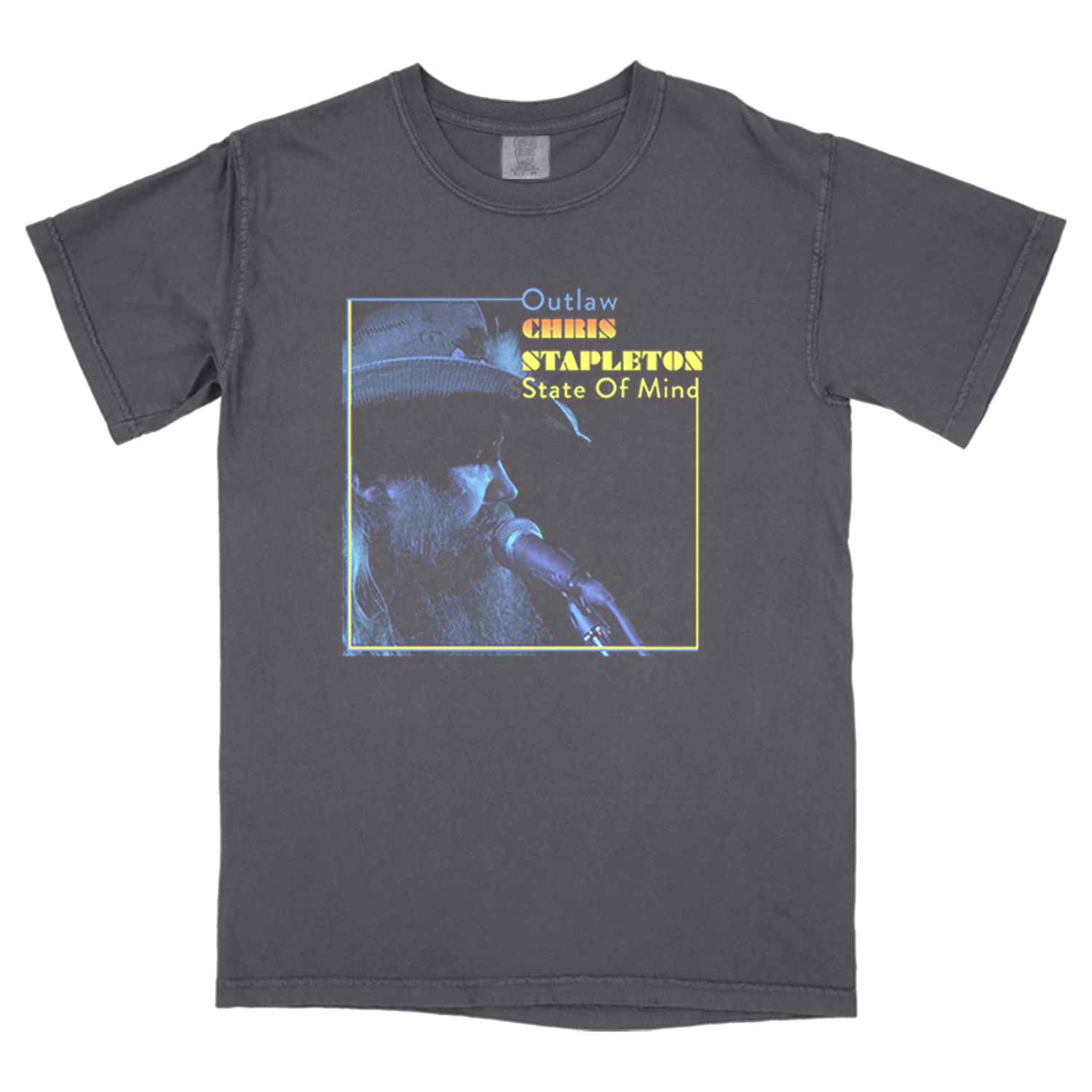 Graphite 100% cotton garment dyed tee featuring Stapleton Outlaw State of Mind design printed on front. This is a reissue of a tee originally printed in 2015.