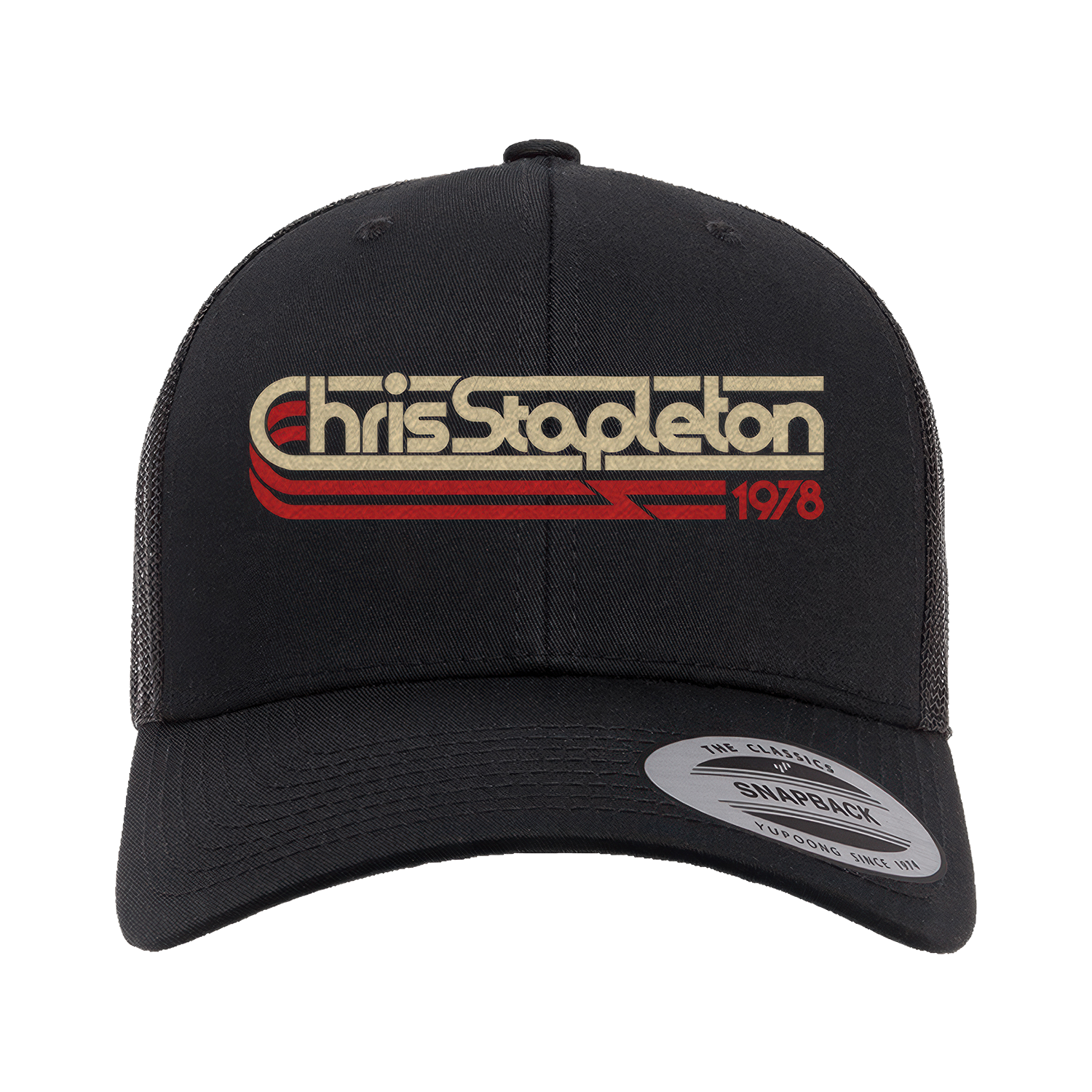 Black retro style trucker cap featuring Chris Stapleton 1978 design embroidered on the front.