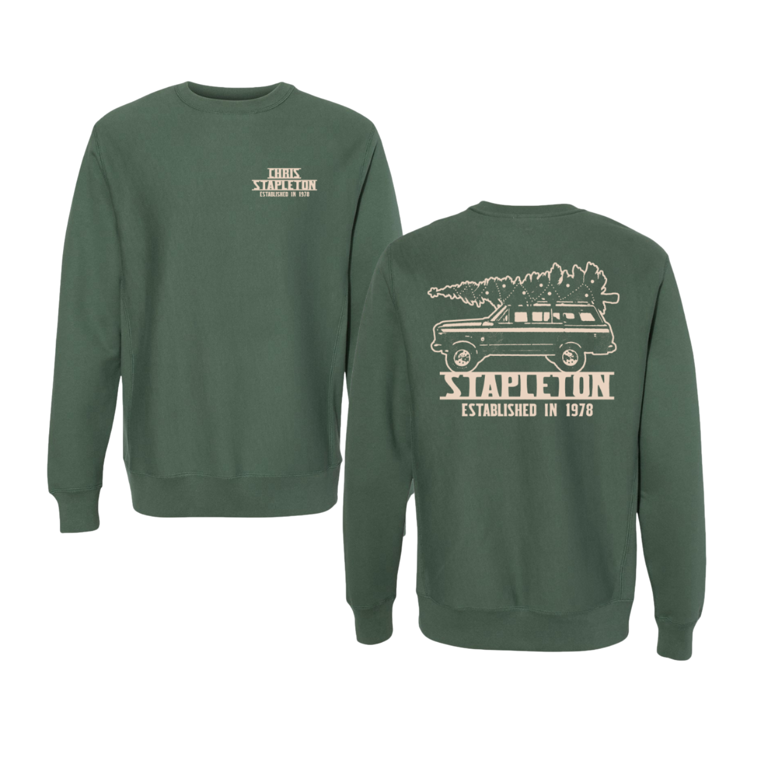 Premium cotton crewneck sweatshirt, constructed of a 13.5oz 3-End fleece fabric with 100% ringspun cotton. Body panels are cut Cross-Grain to limit vertical shrinkage and all seams were sewn with reverse coversttich sewing. Features Chris Stapleton Est. 1978 left front graphic and full graphic on the front featuring a jeep with christmas tree on top.
