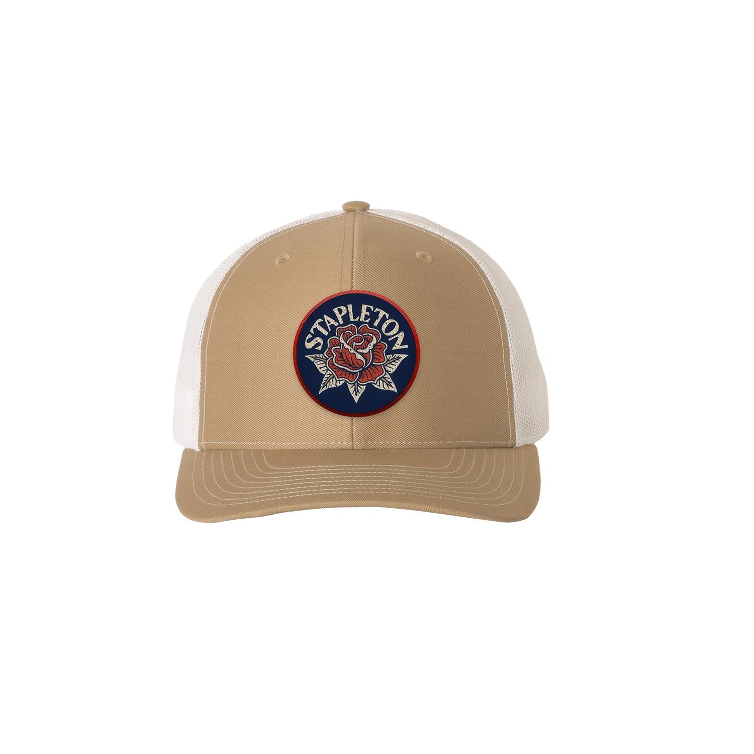 Khaki/White Richardson 112 trucker hat with Stapleton Rose patch on front.